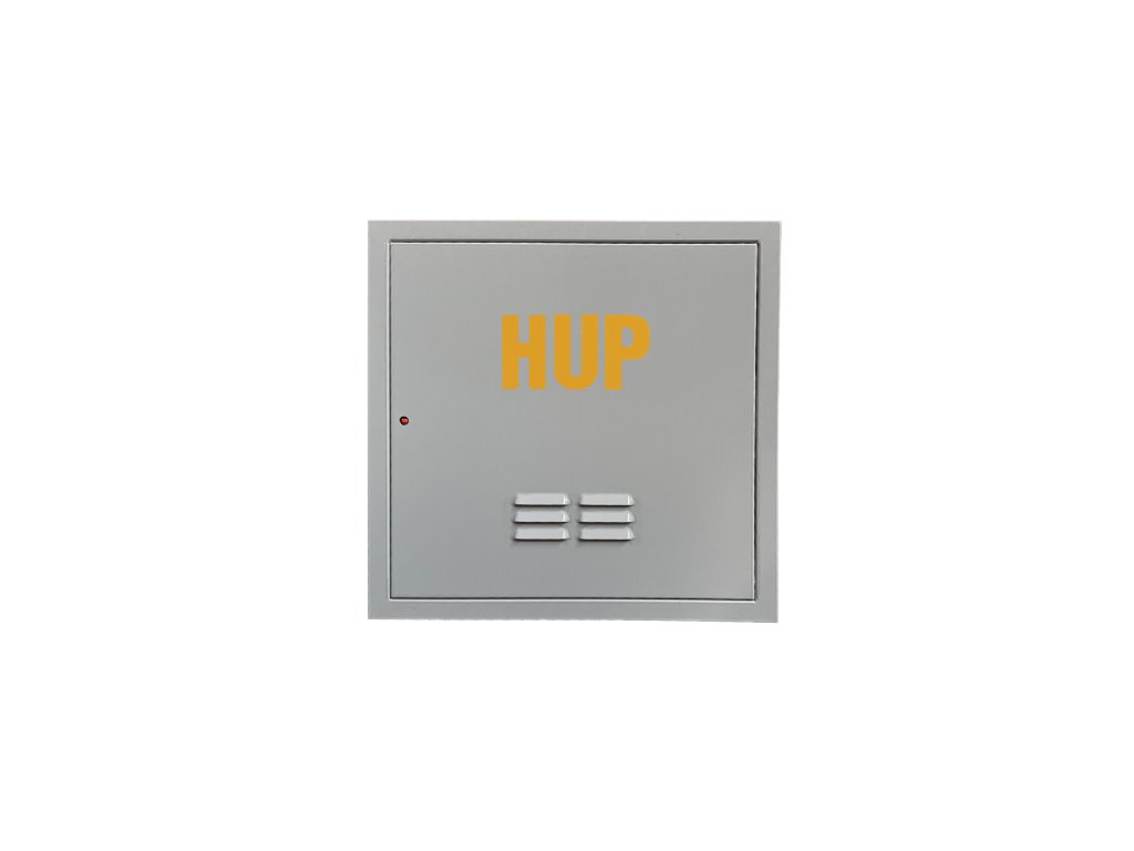 Revizní dvířka plynoměru z pozinkovaného plechu síla 1 mm s povrchovou úpravou lakováním světle šedou barvou v odstínu RAL 7035 s odvětráním. Rám z jednoho kusu, hloubka rámu 55 mm, po obvodu otvory pro uchycení do zdiva. Odvětrání dvířek HUP pomocí protidešťové žaluzie, pět řad prolisů ve dvou sloupcích. Šíře jedné žaluzie 60 mm. Zavírání na čtyřhran. Součástí dvířek je žlutá voděodolná samolepka HUP pro označení hlavního uzávěru plynu a klíček pro otevírání. Revizní dvířka na plyn. Uvedený rozměr udává světlost stavebního otvoru, který je potřeba pro ukotvení revizní dvířek HUP připravit.