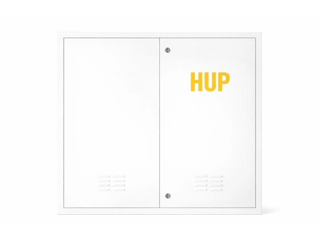 - Dvoukřídlá revizní dvířka s odvětráním a nápisem HUP bez středového sloupku.