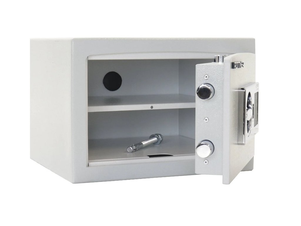 Trezor Fifty EL v šedé barvě jsme vytvořili u příležitosti 50. výročí společnosti Rottner. Trezor disponuje certifikovaným elektronickým zámkem napájeným 9V baterií. Má certifikát bezpečnostní třídy I (ČSN EN 1143-1) a v jeho nitru bezpečně uschováte malé cennosti, cestovní doklady nebo dokumenty. Trezor má 3-stranný uzamykací mechanismus a praktickou poličku uvnitř. Dveře nábytkového trezoru Fifty lze otevřít do úhlu 90°. Trezor má otvory k ukotvení na spodní a zadní straně. Materiál na ukotvení je součástí balení.