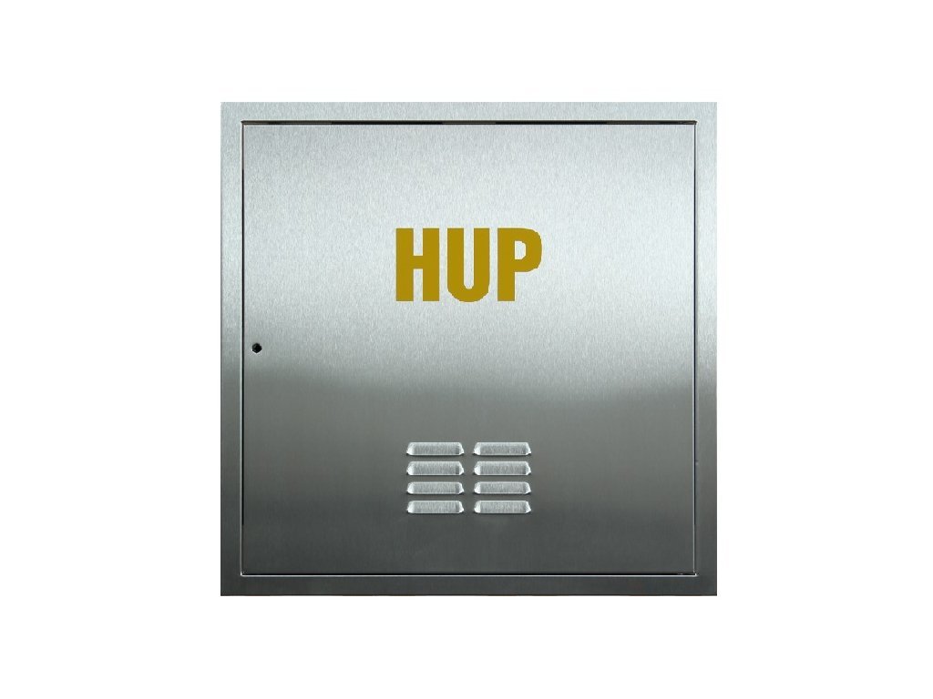 Revizní dvířka na plyn (HUP) a rám jsou vyrobeny z nerezového plechu. Rám z jednoho kusu precizně zpracován – ohyb i na vnější obvodové straně 5 mm zajišťuje pevnost a stabilitu. Na zadní straně rámu příprava pro uchycení do zdiva v podobě oválných a kruhových výseků, hloubka rámu 45 mm, šíře rámu 24 mm. Dvířka mají protidešťové žaluziové průduchy široké 60 mm ve dvou sloupcích a pěti řadách (odvětrávací žebra) ve spodní části. Ke dvířkům jsou také vyráběny shodná revizní dvířka bez děr pro odvětrání, vhodná například pro elektroměr nebo zakrytí technických šachet.