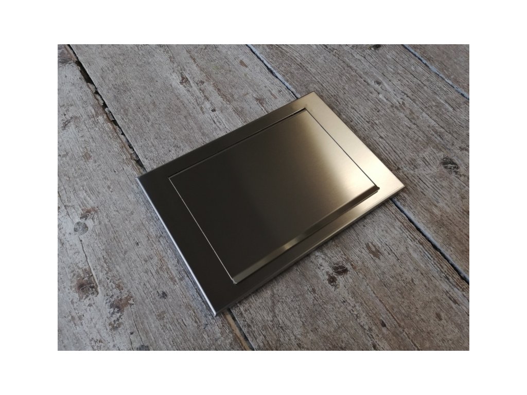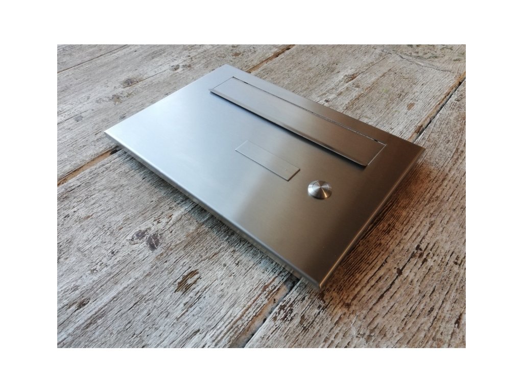 Přední štítek - Ostré hrany štítku, jmenovka průhledná, tlačítko zvonku v barvě štítku, s 1 zvonkem a 1 jmenovkou je pro šířku formátu A4 z nerezového plechu 1,3 mm.
