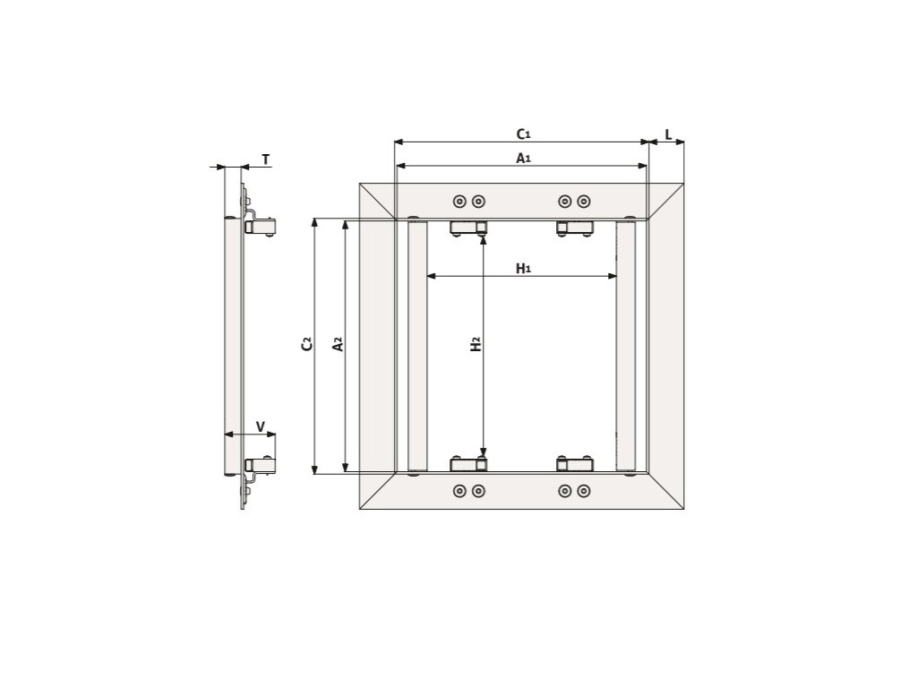 Revizní dvířka jsou vyráběna z hliníkových profilů, které jsou svařovány do rámů. Dvoukřídlé provedení je složeno z jednoho vnějšího a ze dvou vnitřních rámů. Kompletní sestava je spojena pomocí pevných pantů a umožňuje tak otevírání jednotlivých křídel dvířek v případě potřeby.