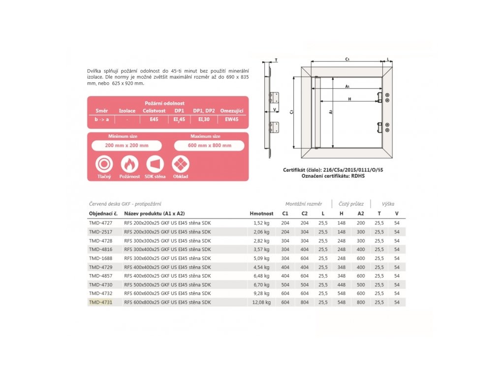Revizní dvířka do SDK stěny protipožární RFS 600x600x25 mm GKF US EI45