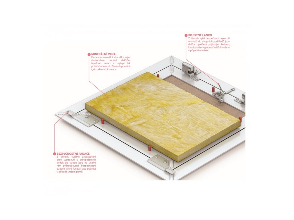 Aby dvířka splňovala uvedenou požární odolnost, musí být po zabudování do sádrokartonového stropu vždy osazena minerální vlnou v tloušťce 25 mm, která musí zároveň splňovat objemovou hmotnost 150 kg/m3.